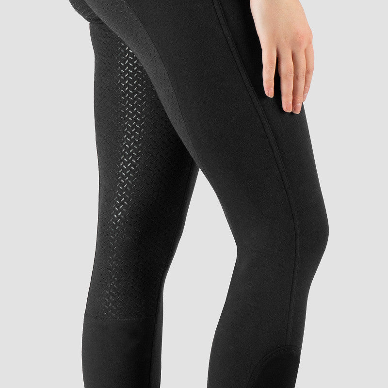 Basic-Reithose für Damen mit zwei Vordertaschen und einem matten Reiss-Silikon-Sitz. Produktspezifikationen: Basic-Reithose aus gestrickter Baumwolle, elastischer Knöchelverschluss, Gürtelschlaufen, zwei Vordertaschen, matter Silikon-Sitz. Material: 95 % Baumwolle, 5 % Elasthan, gestrickt