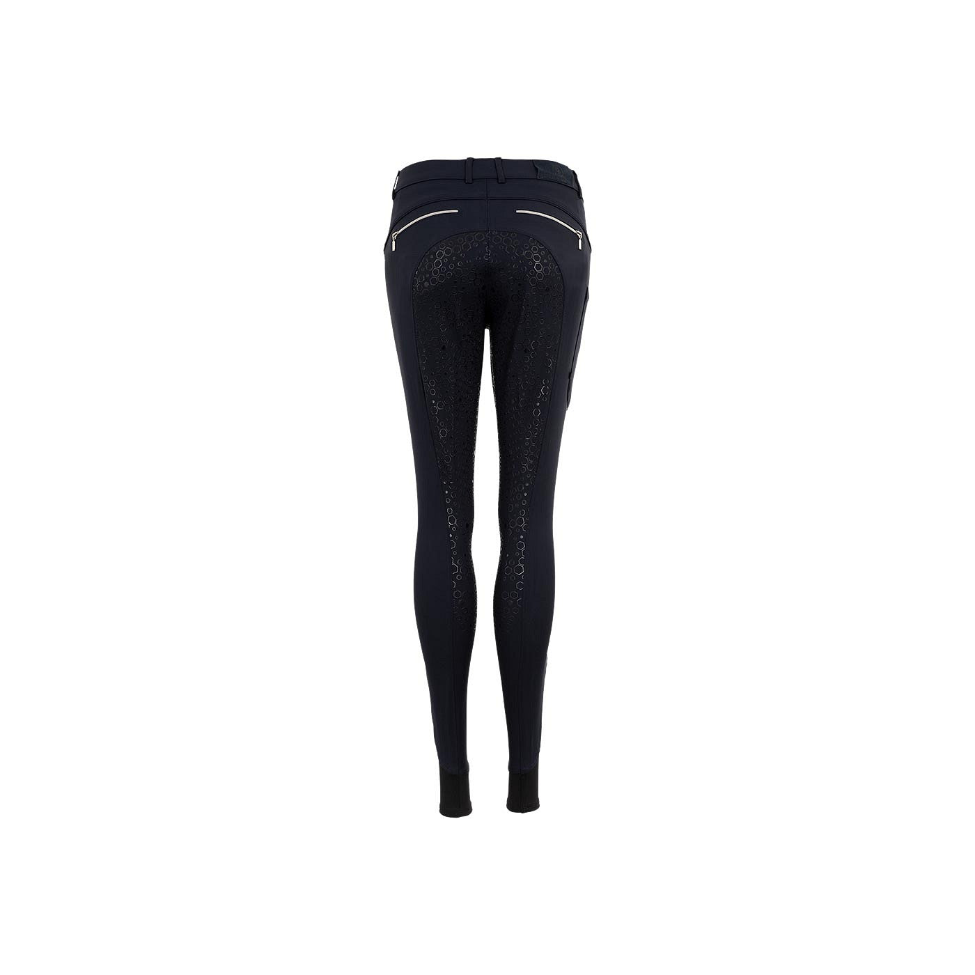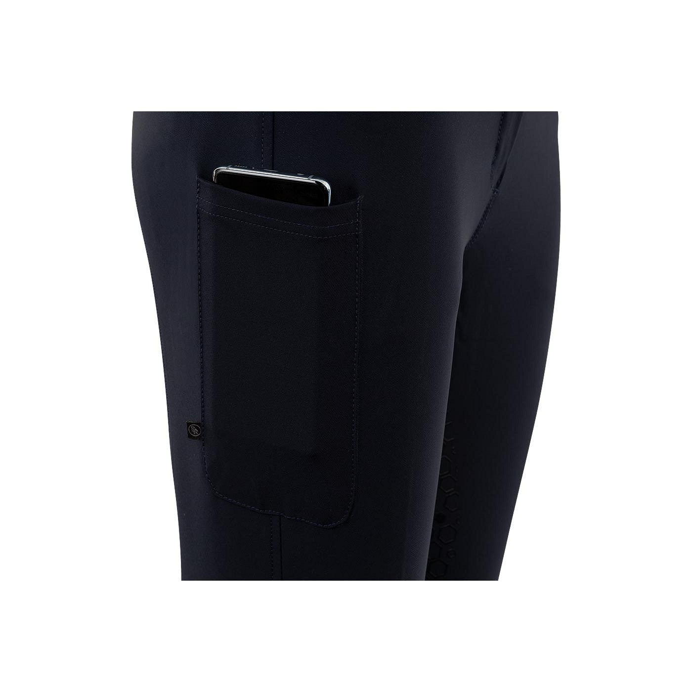 Am rechten Bein befindet sich eine tiefe Tasche, die perfekt für ein Mobiltelefon geeignet ist. Zusätzlich hat die Reithose zwei Jeanstaschen vorne und zwei Reißverschlusstaschen hinten. Der Stretchbund mit Gürtelschlaufen und der elastische Beinabschluss sorgen für eine schöne, eng anliegende Passform. Der Silikonbesatz mit grafischem Muster sorgt für einen stabilen Sitz.