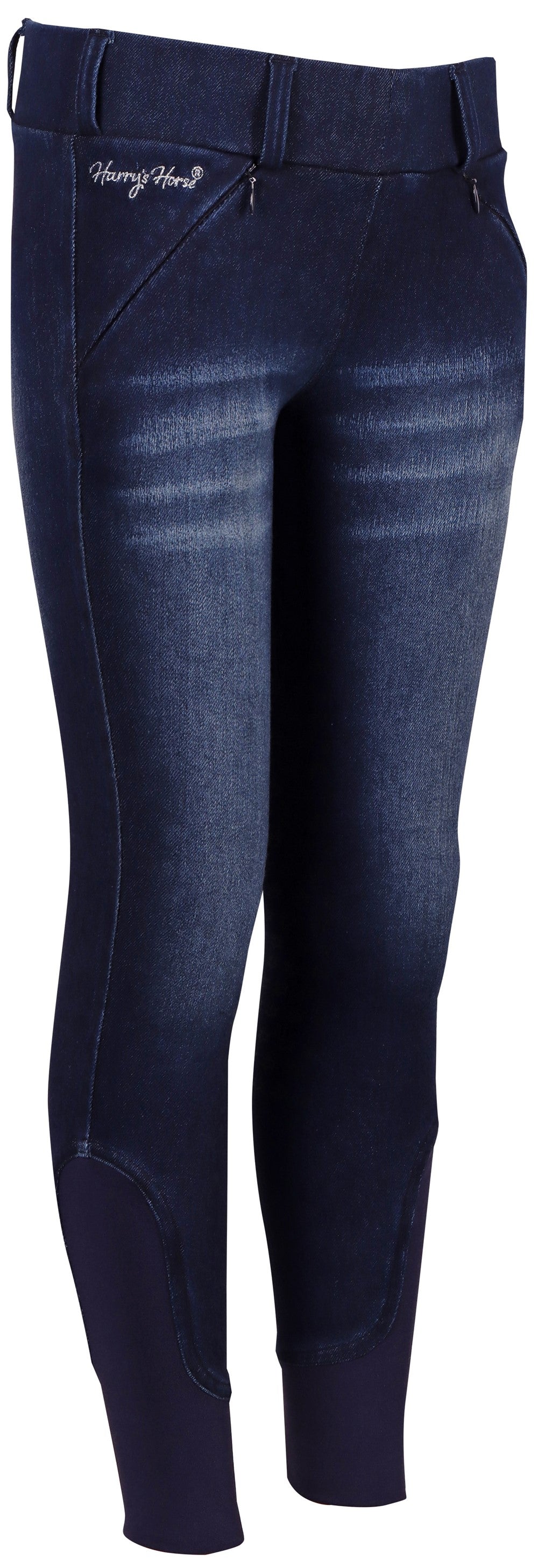 Reitleggings im Denim-Look mit lustiger Waschung und Diva-Logos, einem Badge am Bund, Gürtelschlaufen, zwei Taschen, einem rundgenähten Gesäß mit Silikondruck und einem elastischen Einsatz am Knöchel für mehr Komfort in den Reitstiefeln.