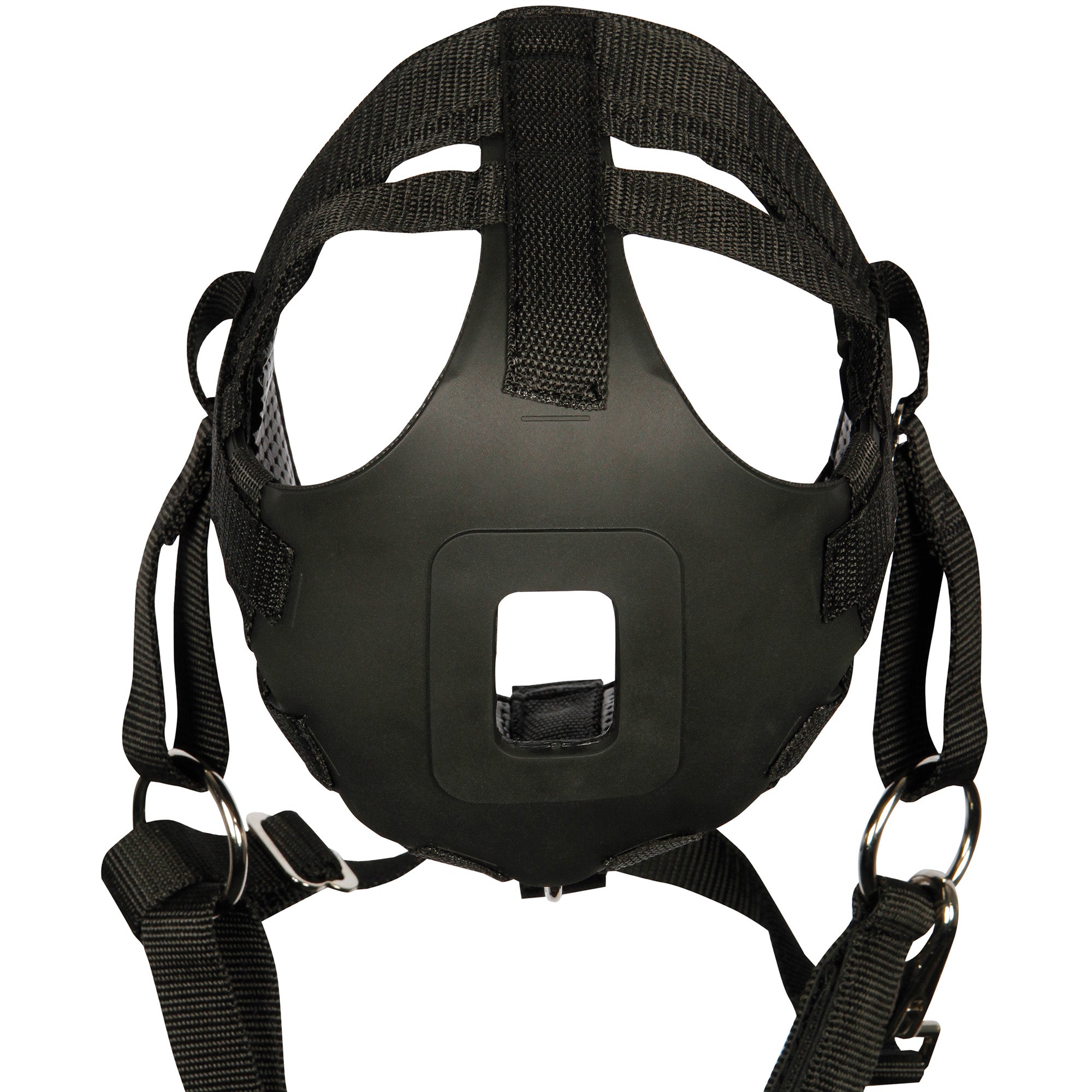 Graasmasker met uitsparingen waardoor aanzienlijk minder gras gegeten kan worden, maar wel normaal kan worden gedronken en gegeten.