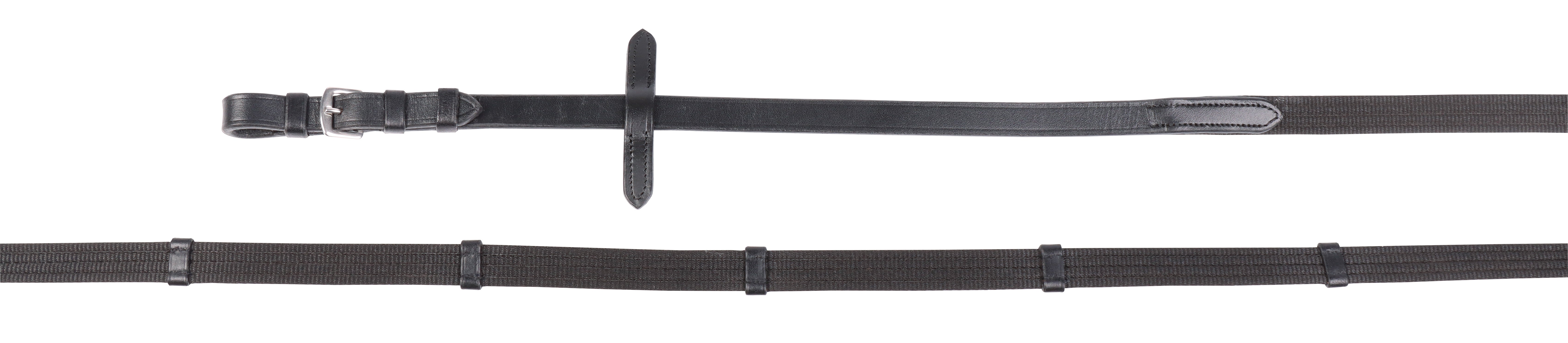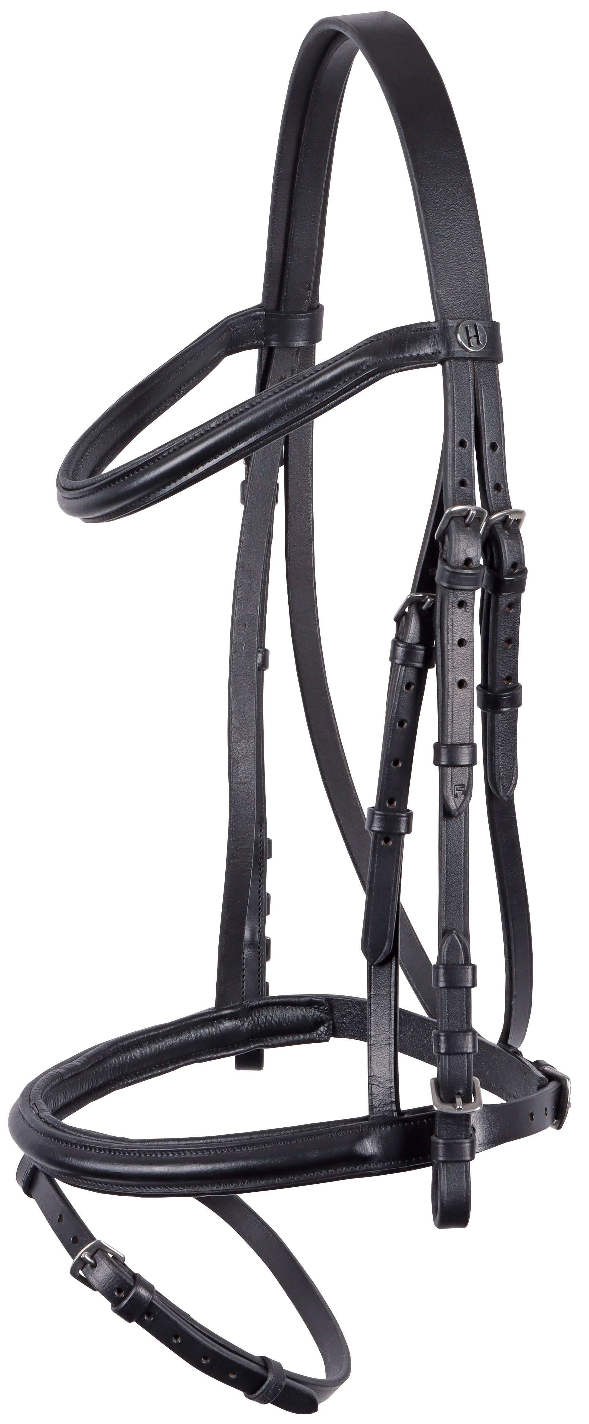 Lederzaumzeug mit kombiniertem Nasenriemen mit schwarzer Polsterung, Schnallen aus Edelstahl und Gurtzügeln mit Stoppern.