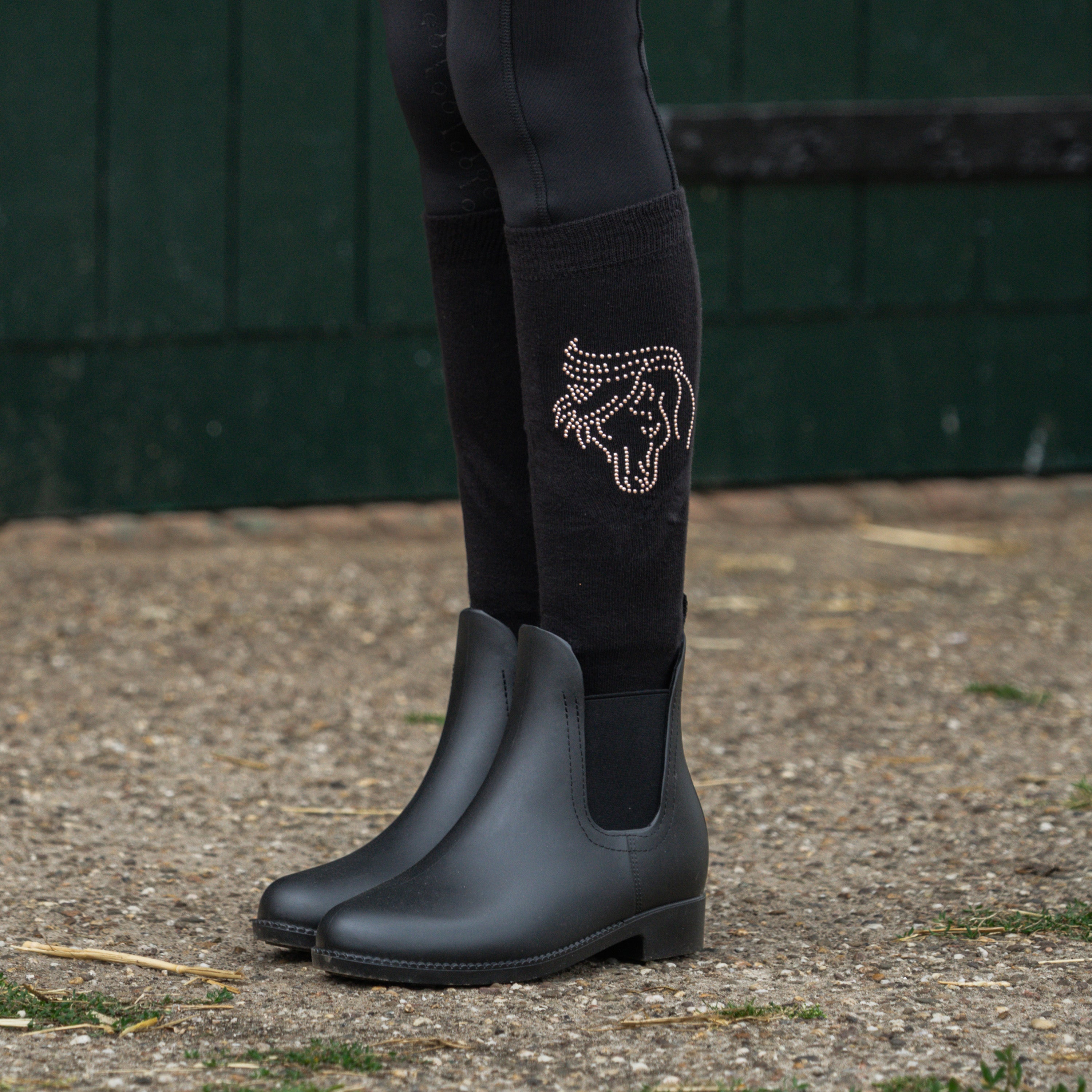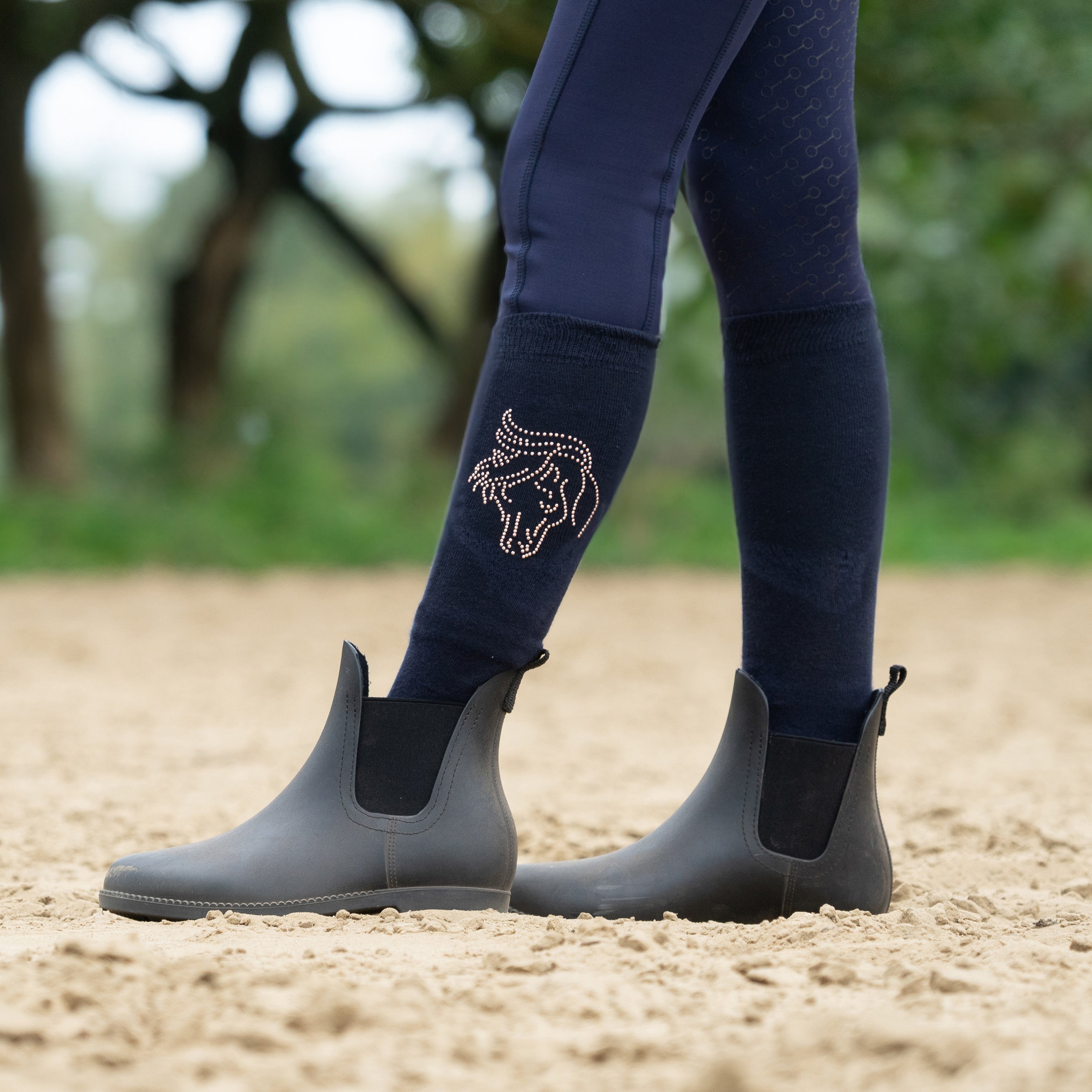 Baumwollsocken mit weichem Fußbett und einem Pferd aus Kristallen auf der Wade. Produktspezifikationen: < Baumwollsocken mit weichem Fußbett Kristallpferd auf der Wade Verpackung: 3 Paar pro Farbe Größen: XS (27 30) S (31 34) M (35 38) L (39 42) Material: < : 75% Baumwolle 5% Lycra