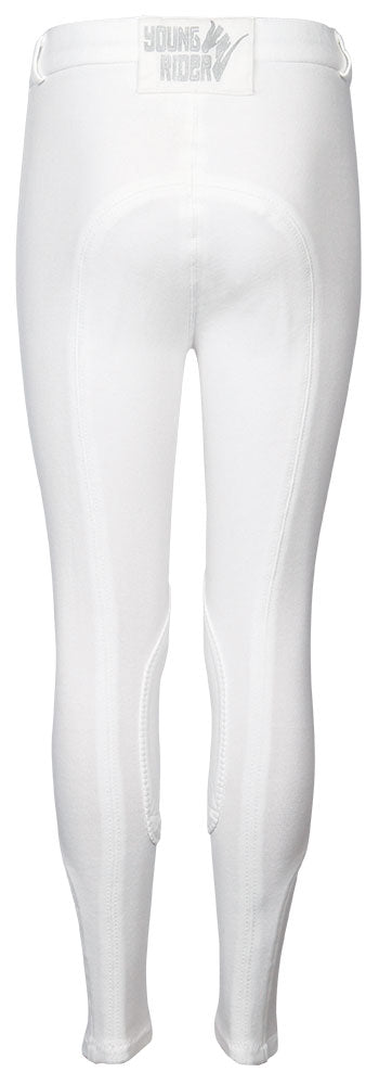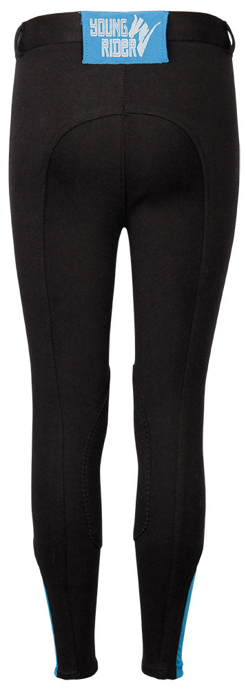 Rijbroek met zakje met ritssluiting, contrast kleur elastische inzet aan de onderzijde van de pijpjes, rondgenaaid zitvlak, leuke badge op de tailleband