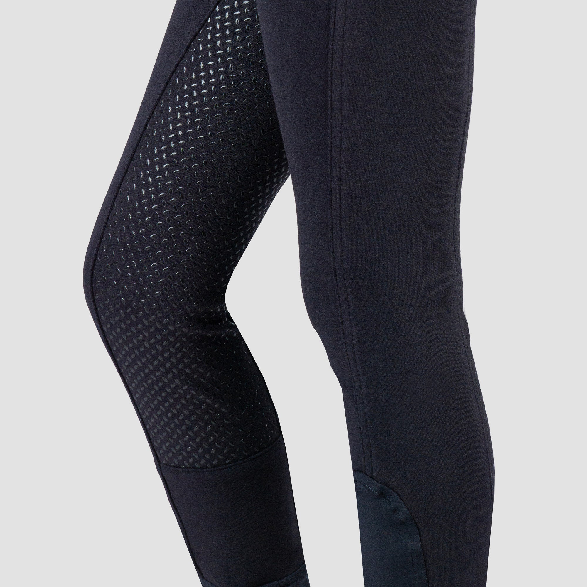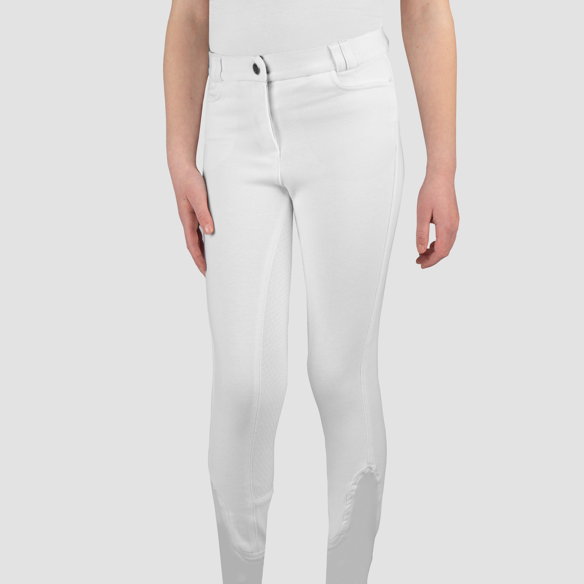 Einfache Junior-Reithose mit zwei Vordertaschen und einem matten Reiss-Silikon-Sitz. Produktspezifikationen: Einfache Reithose aus gestrickter Baumwolle, elastischer Knöchelverschluss, Gürtelschlaufen, zwei Vordertaschen, matter Silikon-Sitz. Material: 95 % Baumwolle, 5 % Elasthan, gestrickt