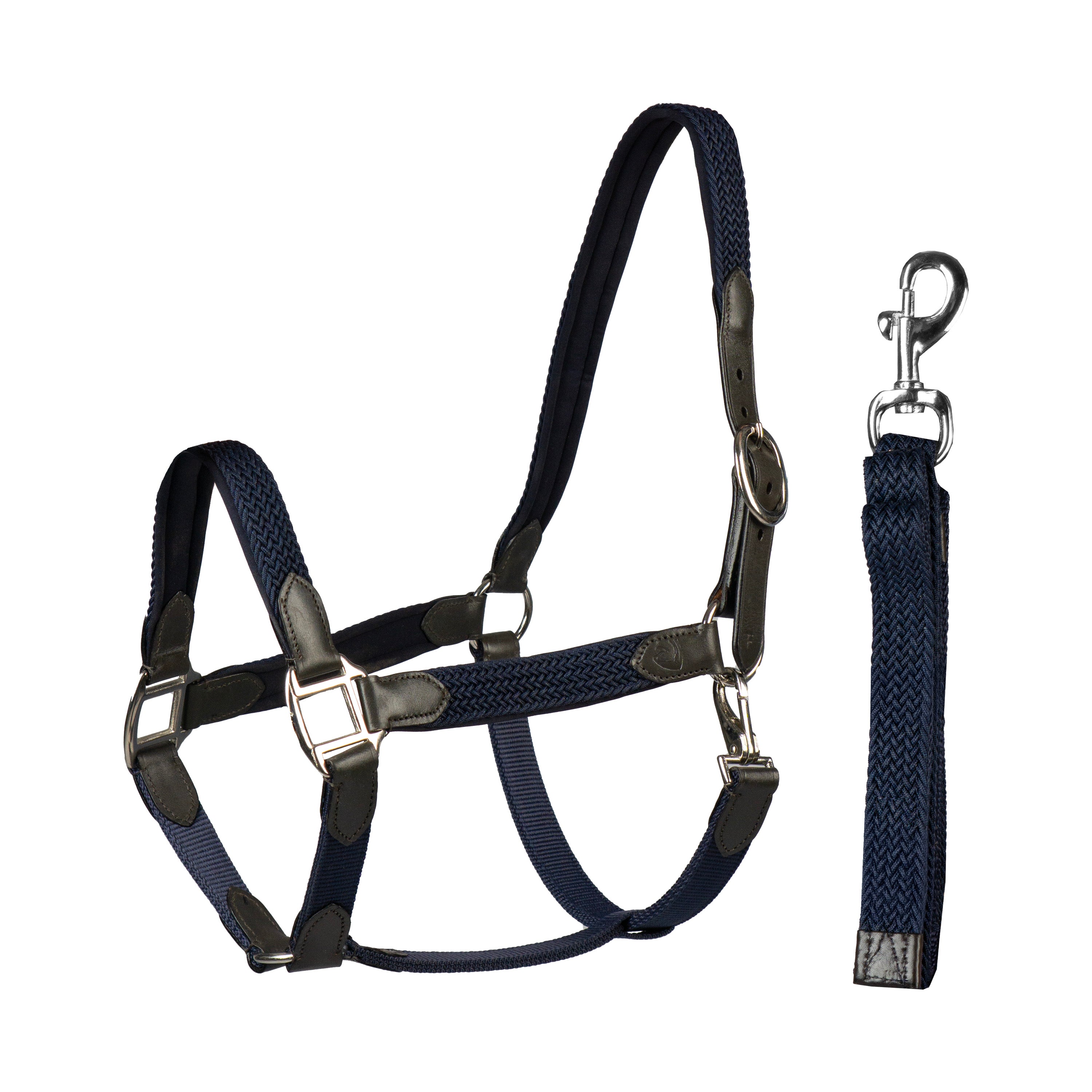 Stilvolles Halfter-Set mit weichem Neoprenfutter und geflochtenen Nylondetails. Das Halfter ist am Genickstück verstellbar und wird mit einem passenden Führstrick geliefert. Produktspezifikationen: < Lederhalfter mit geflochtenem Nylon. Mit weichem Neopren gefüttert. Wird mit passendem Strick geliefert. Das Halfter kann am Genickstück verstellt werden. Material: < Leder, Nylon und Neopren