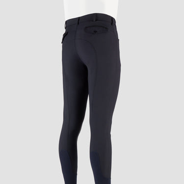 Exklusive High-End-Reithose für Herren aus hochtechnischem Material mit zwei Vorder- und Gesäßtaschen. Die Hose verfügt über Mesh-Söckchen und matte Silikon-Kniebesätze. Produktspezifikationen: Zwei schräge Vordertaschen, zwei Gesäßtaschen mit Druckknöpfen, Mesh-Söckchen, kontrastierende Paspeln an den Taschen, leichte, matte Silikon-Kniebesätze. Material: 90 % Mikro-Nylon, 10 % Elastan.