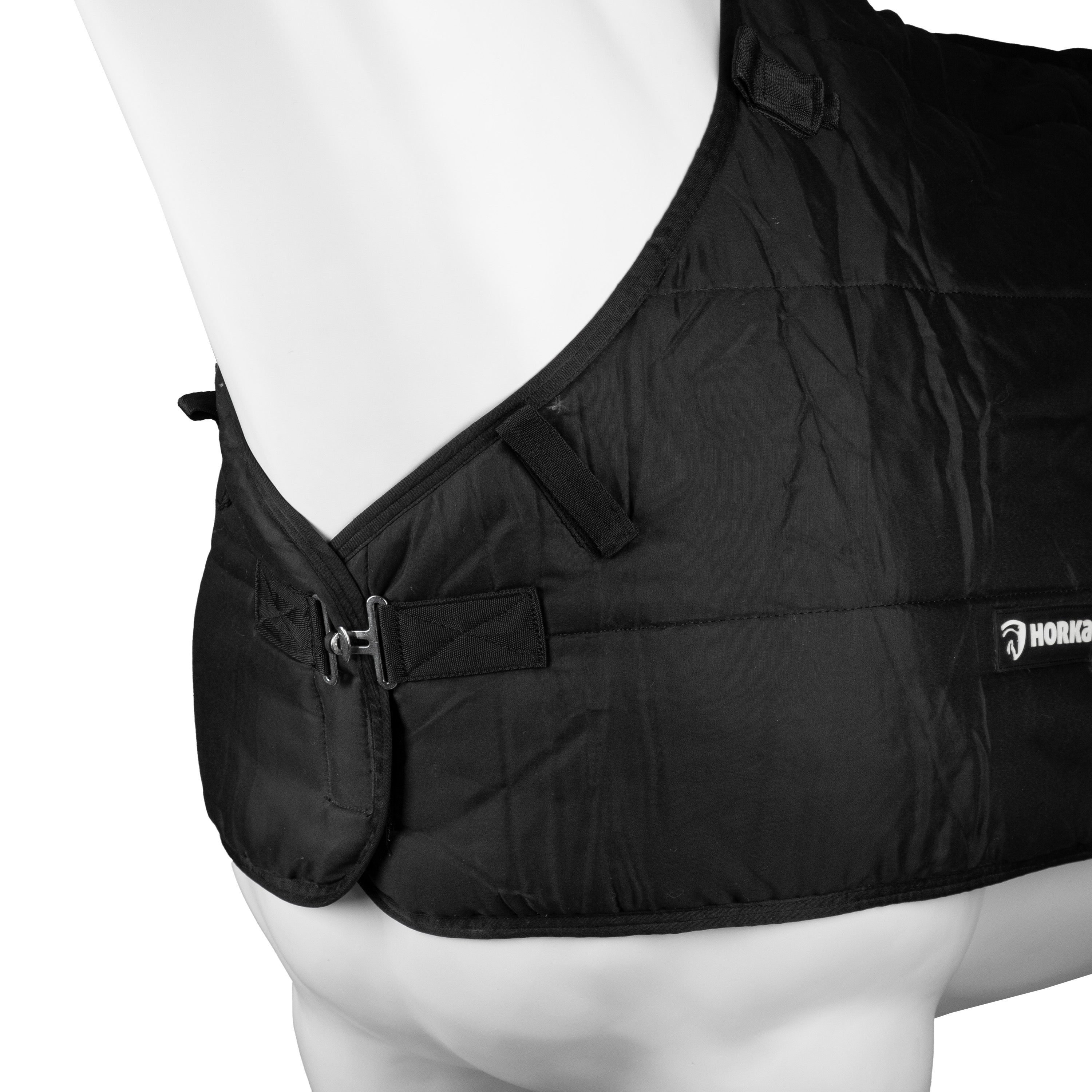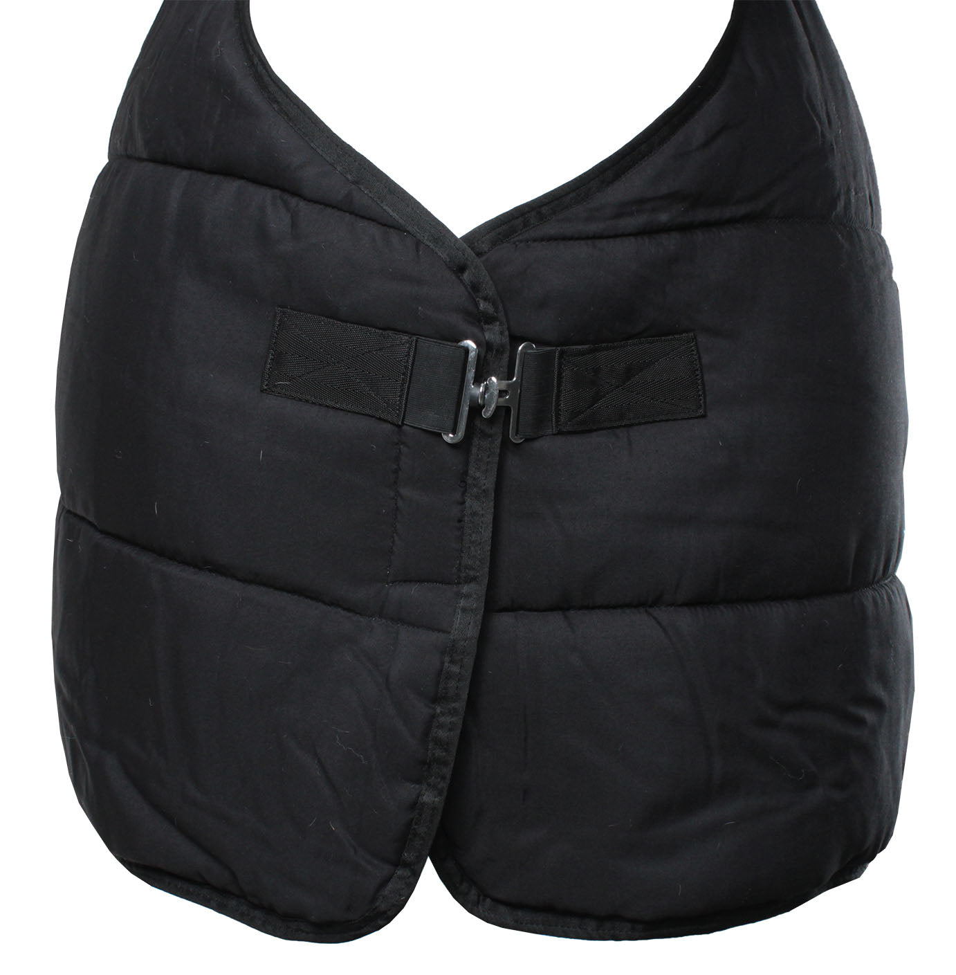 Weiche Unterdecke aus Polyester (blau). Produktspezifikationen: Polyesterfutter, 100 Gramm Füllung, Vorderverschluss des Sattelgurts mit Klettverschluss, D-Ring-Befestigungen für Beingurte, mit Fleece gefütterter Widerrist, Klettschlaufe am Widerrist zum Befestigen der Unterdecke an einer Outdoor-Decke.