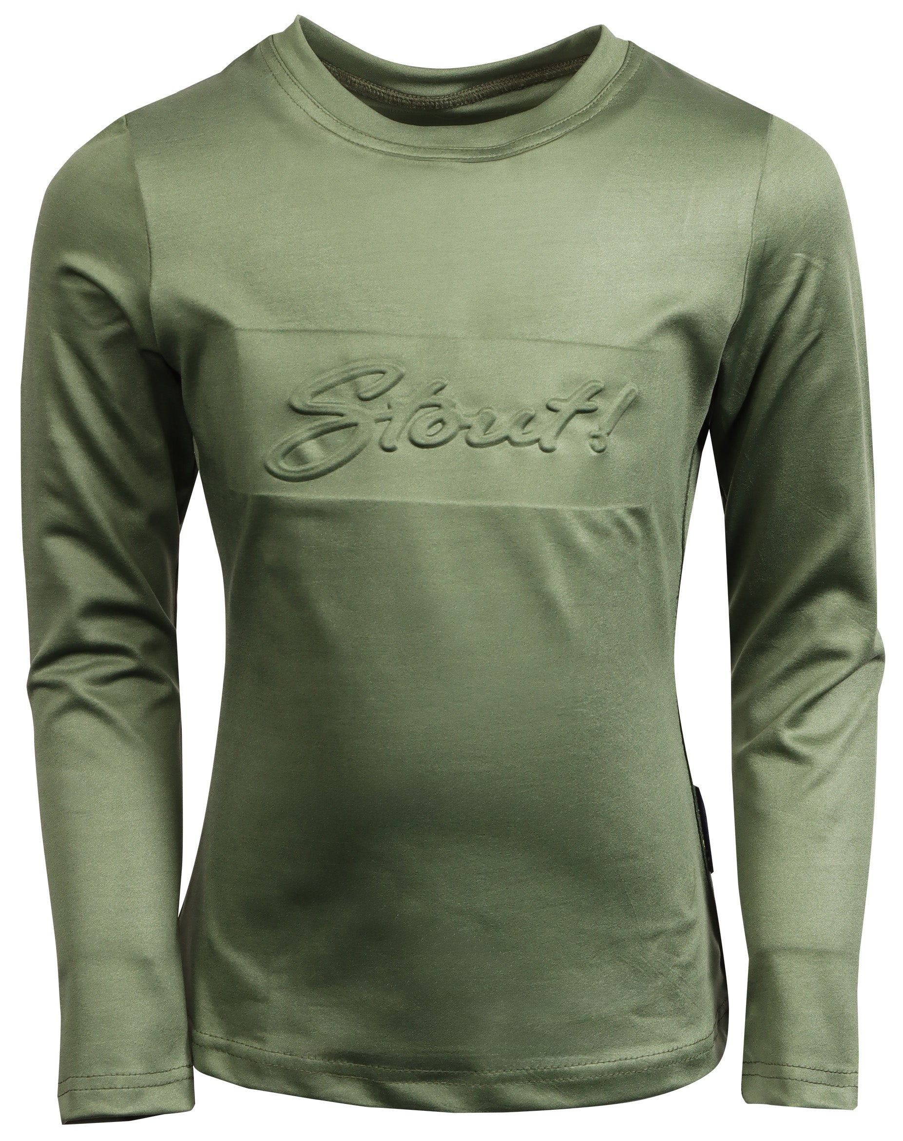 Shirt met lange mouw en ronde hals, STOUT! Logo op de borst en aan de linkerkant een band met STOUT! print erop.