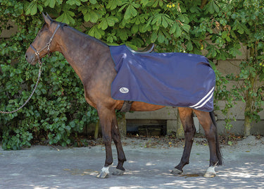 Waterdichte uitrijdeken in dress blues met reflecterende strepen voor optimale zichtbaarheid en veiligheid, met staartlus, voorzien van een fleece voering.