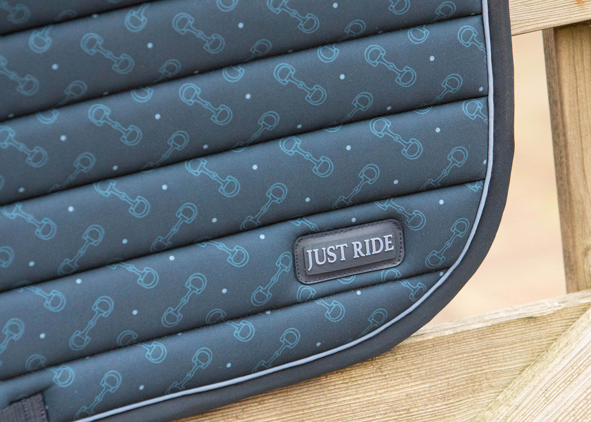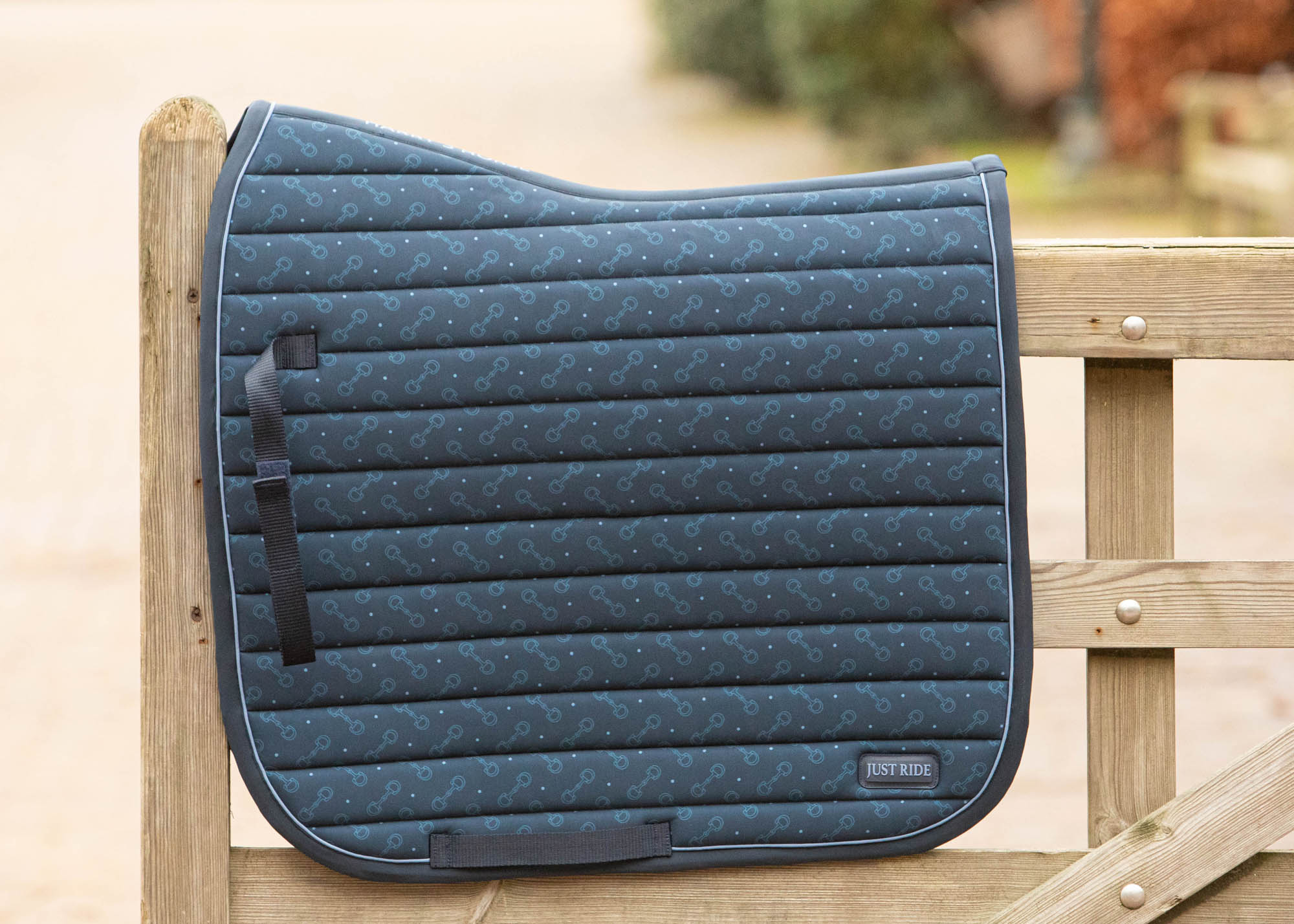 Satteldecke mit horizontaler Steppung, kontrastierender Zierpaspelierung, einem durchgehenden Muster, Sattel- und Gurtschlaufen sowie einem schnelltrocknenden und atmungsaktiven Coolmesh-Futter.