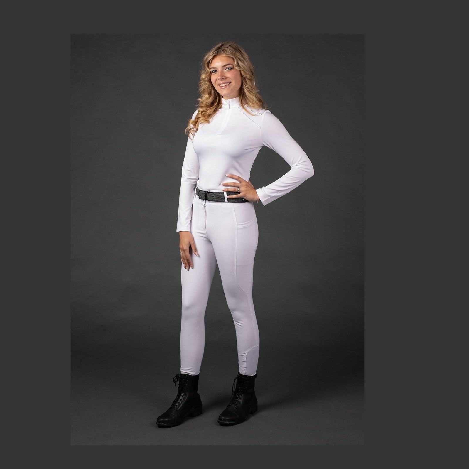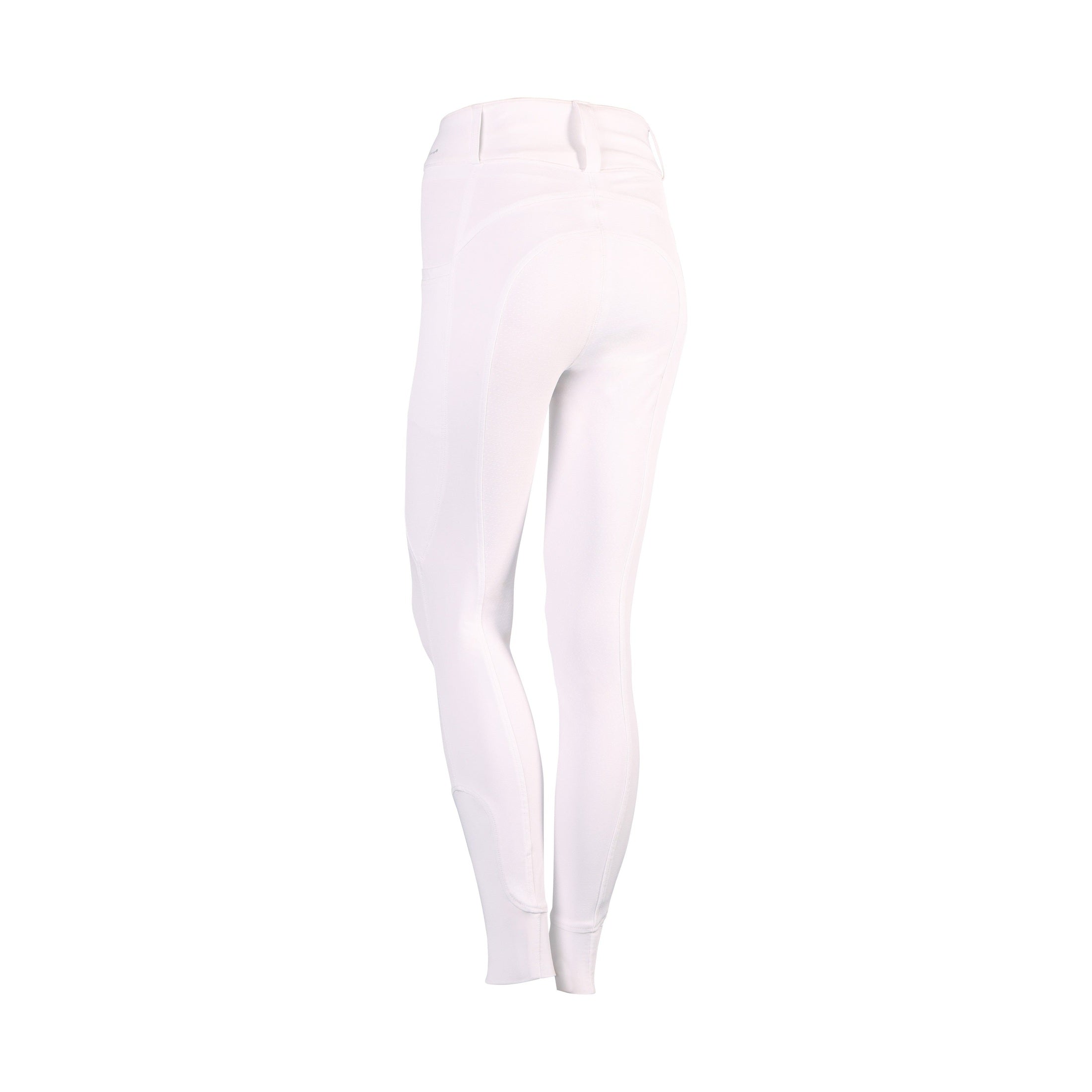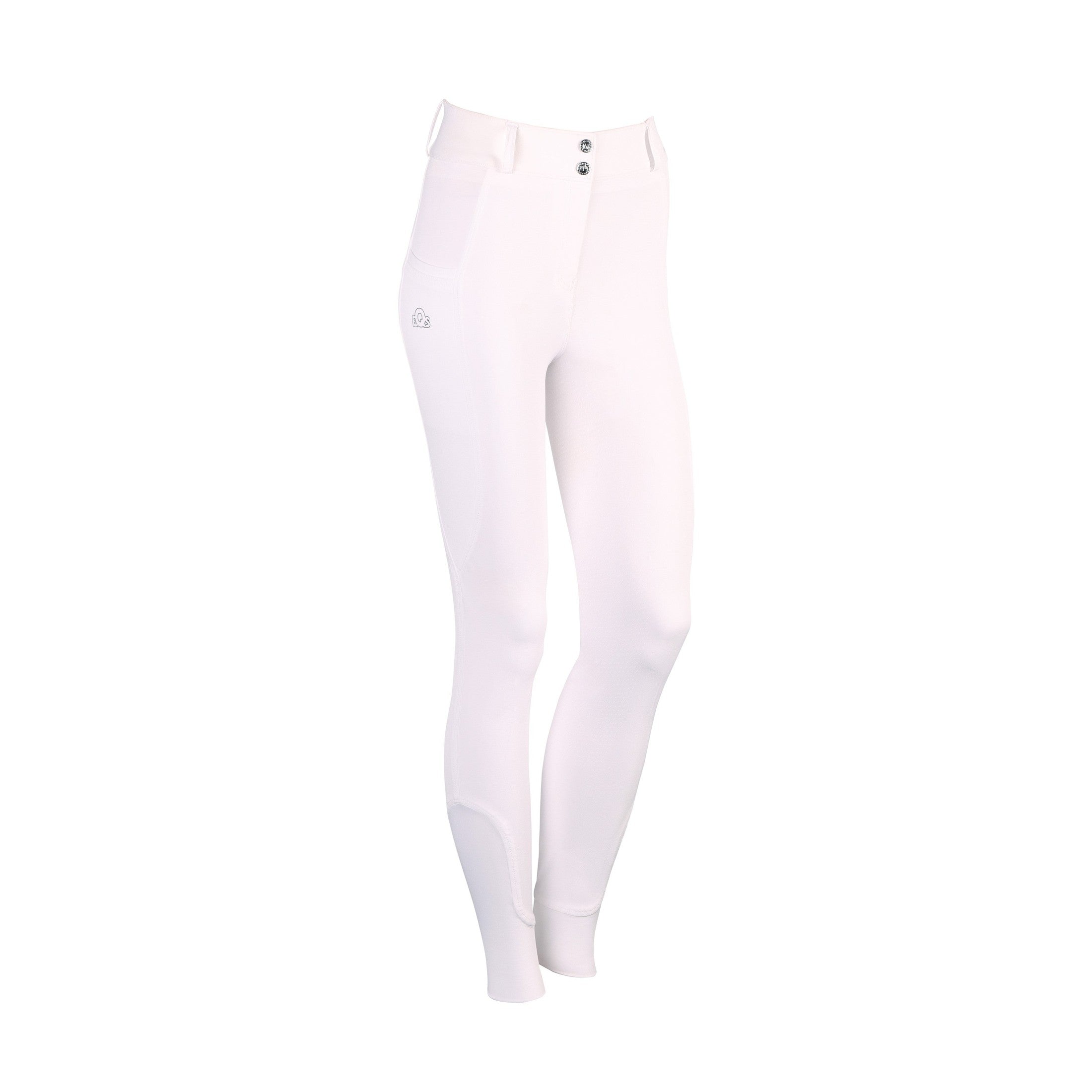 Rijbroek met hoge tailleband, twee zakken aan de zijkant met een zilverkleurige EQS print, rondgenaaid zitvlak voorzien van een siliconen print voor extra grip in het zadel en een elastische inzet rond de enkels voor meer comfort in je rijlaarzen.