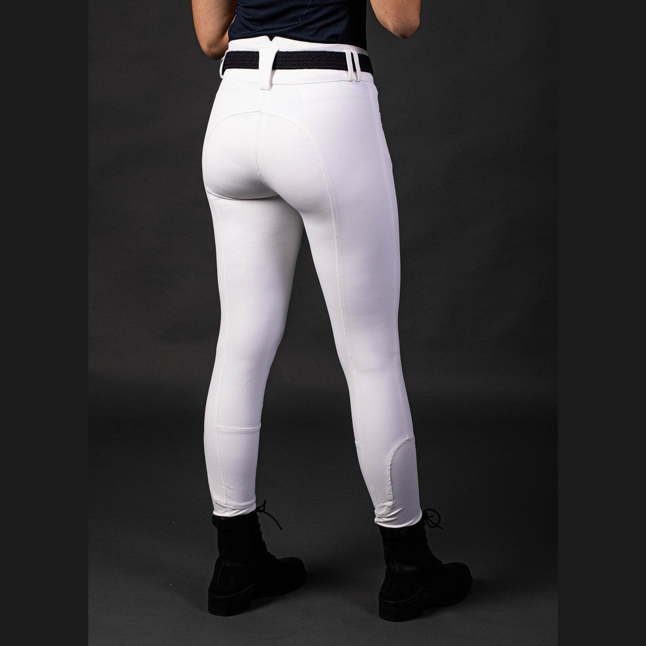 Rijbroek met een hoge tailleband met riemlussen, twee steekzakken, rondgenaaid zitvlak voorzien van een siliconen print voor extra grip in het zadel en "Flexlegs" voor extra comfort in de rijlaarzen.