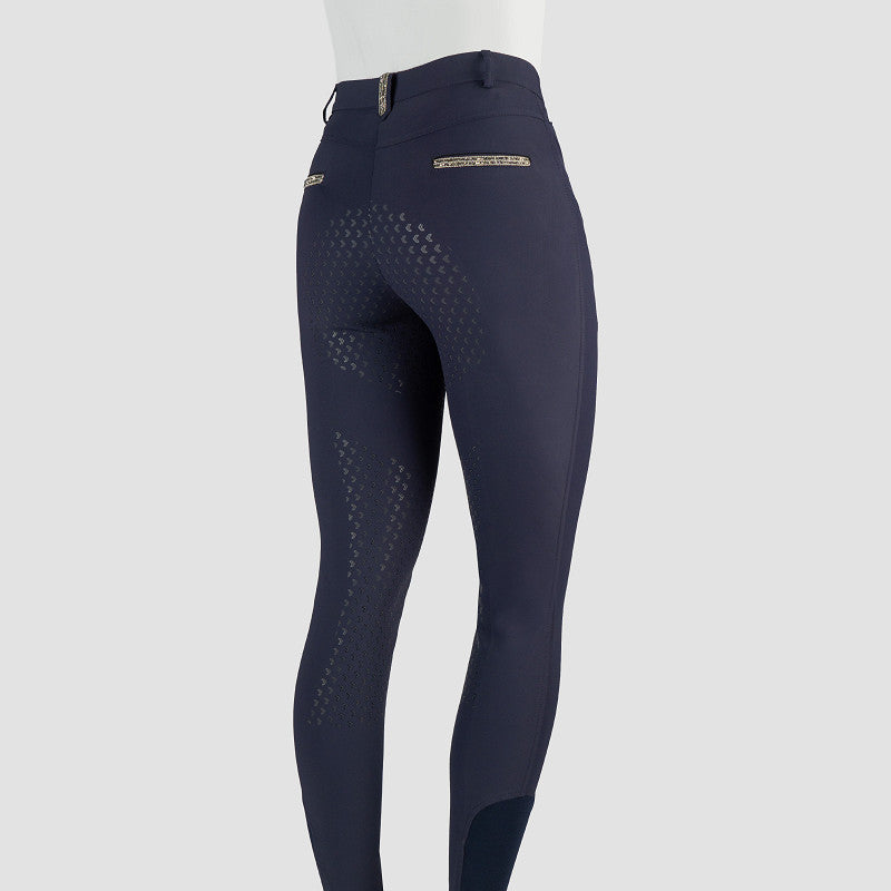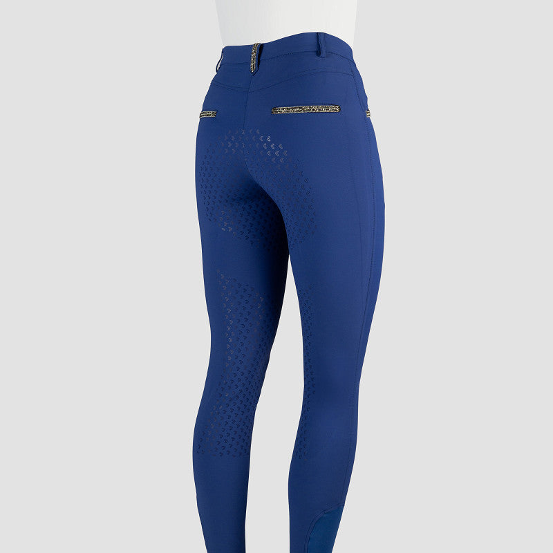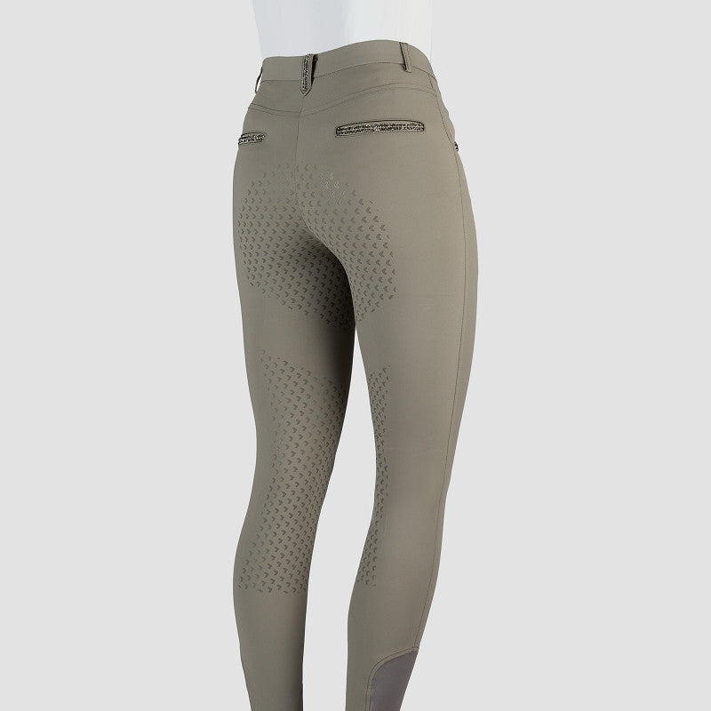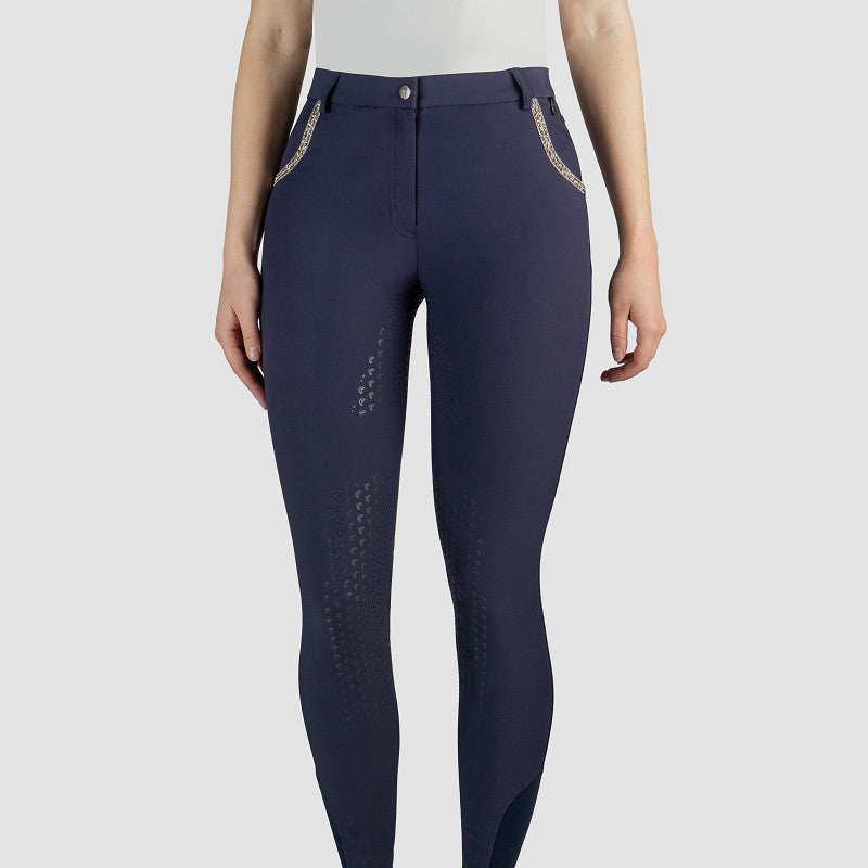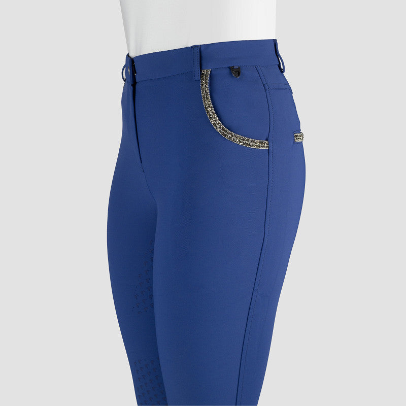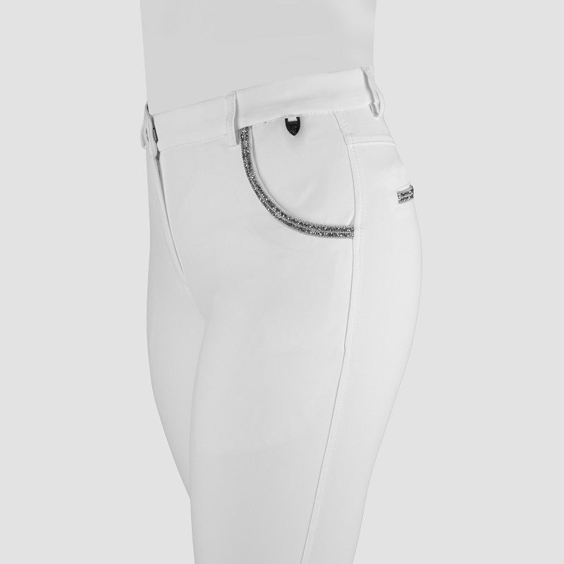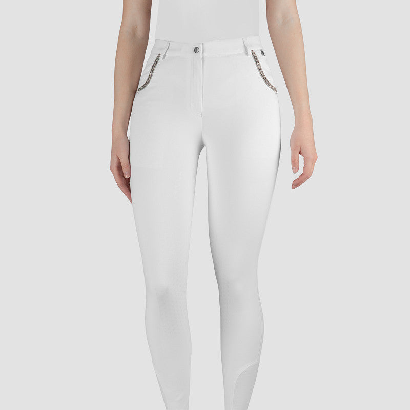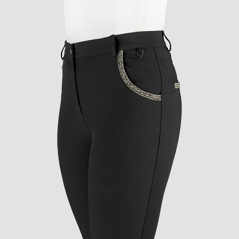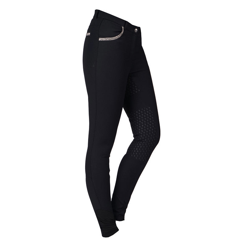 Een bestseller rijbroek uit hoogwaardige technische stof in een exclusieve stijlvolle glitter versie. De Nicola is een elegante rijbroek met een flatterende pasvorm gemaakt van zeer technische Super X stof met waterafstotende vochtregulerende ademende en verkoelende eigenschappen. Glittertape op achterste riemlussen en op de voor en achterzakken en de subtiel geprinte siliconen zitvlak delen maken van deze rijbroek een must have zowel voor casual rijden als voor show. Productspecificaties: Modieuze en elegante damesrijbroek uit hoogwaardige Super X stof Water afstotend vochtregulerend ademend en verkoelend Subtiele glitter details op zakken en riemlussen Twee voorzakken diep genoeg voor mobiele telefoon Verkrijgbaar in 4 standaard kleuren en 1 seisoencollectiekleur Geprinte matte silicone zitvlak delen Materiaal: 88% Nylon 12% Spandex Super X fabric geweven