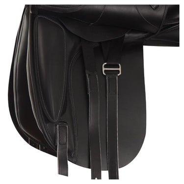 Het BR dressuurzadel Monteverdi is vervaardigd van hoogwaardig Europees leer. De diepe zit is bekleed met glad leer en de rest van het zadel is volledig bekleed met zacht leer voor extra grip. De kniestukken zijn niet alleen anatomisch gevormd, maar ook royaal gevuld voor optimaal comfort. De kniewrongen garanderen een perfecte ligging en ondersteuning van het been. Het zadel wordt geleverd met één paar kleine en één paar grote kniewrongen, die naar eigen inzicht bevestigd kunnen worden met klittenband. Het zadel heeft een anatomisch gevormde, polypropyleen zadelboom en een verwisselbaar BR kopijzer van verenstaal in maat medium/wijd. Het kopijzer is ook los verkrijgbaar in andere maten. Het zadel is voorzien van breed dragende kussens gevuld met een mix van echte en synthetische wol omhuld met een laag neopreen om veerkracht en vormbehoud te garanderen. De combinatie van materialen zorgt voor een evenwichtige verdeling van het gewicht van de ruiter en voorkomt drukplekken. Het zadel is uitgerust met singelstoten van chroomleer. De voorste singelstoot komt vanuit de kniewrong en de achterste is bevestigd in een V-model. In totaal heeft het zadel drie singelstoten aan iedere kant. Het zadel kan hierdoor op verschillende manieren aangesingeld worden voor een optimale zadelligging. Het zadel is bijzonder mooi afgewerkt met contraststiksel. Inclusief luxe, gevoerde BR zadelhoes met extra opbergmogelijkheid voor de singel.