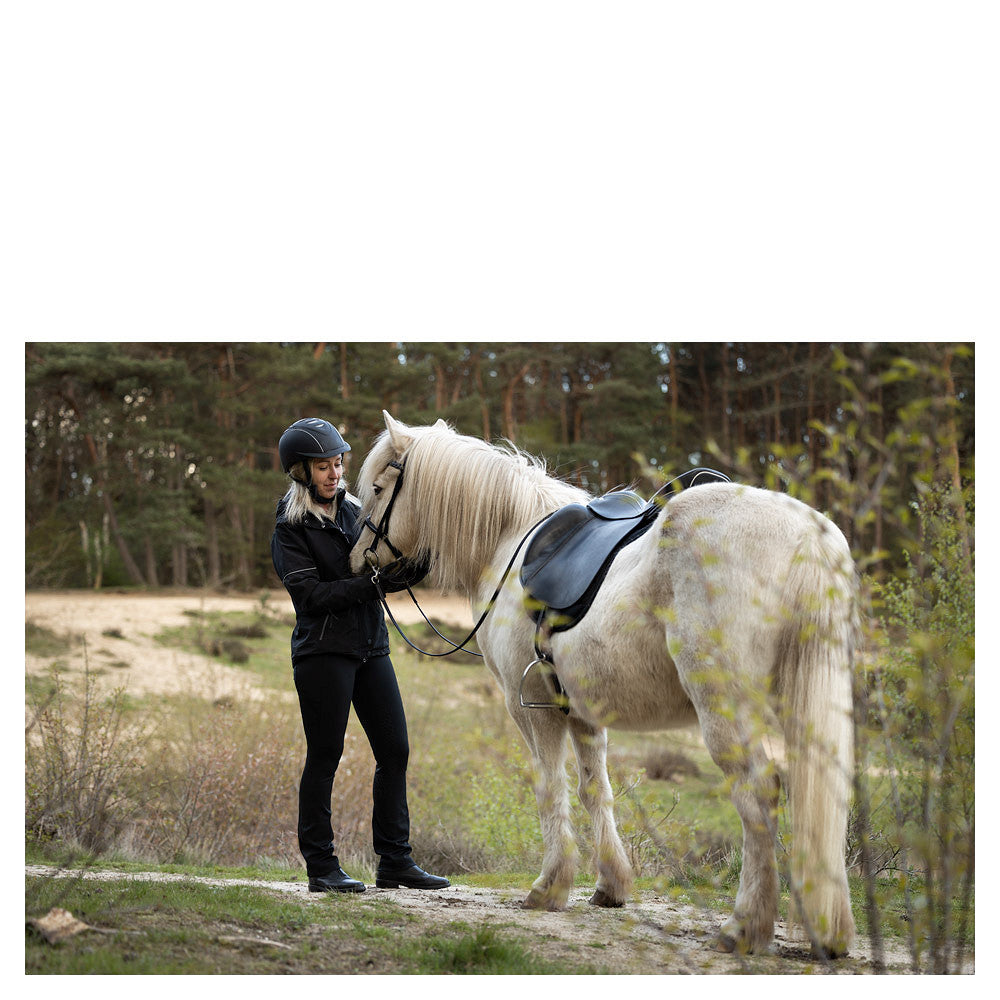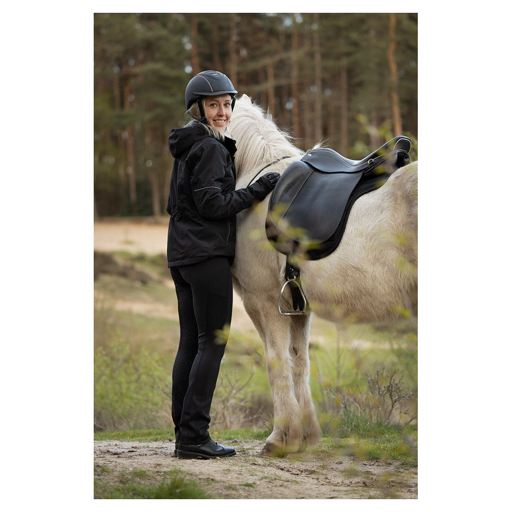 De elegante rijlegging Maeva is gemaakt van een zachte stof die ademend en sneldrogend is voor optimaal draafcomfort. Daarnaast sluit de rijlegging mooi aan op de huid dankzij de stretch tailleband met riemlussen en het 4-way stretchmateriaal. Dit geeft een zeer goede bewegingsvrijheid. De opgestikte zakken zijn diep en daardoor perfect geschikt om je mobiele telefoon in te stoppen. Het siliconen zitvlak zorgt voor extra grip en een stabielere zit.
