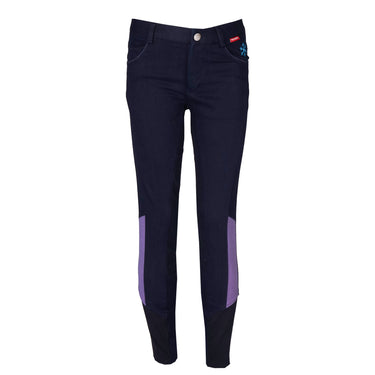 Junior rijbroek in gekleurde jeansstof met verwassen effect Productspecificaties: Elasta enkel sluiting Voorzakken Riemlussen RH Kids borduursel op achterzak Materiaal: 75% Katoen 20% Polyamide 5% Elastan