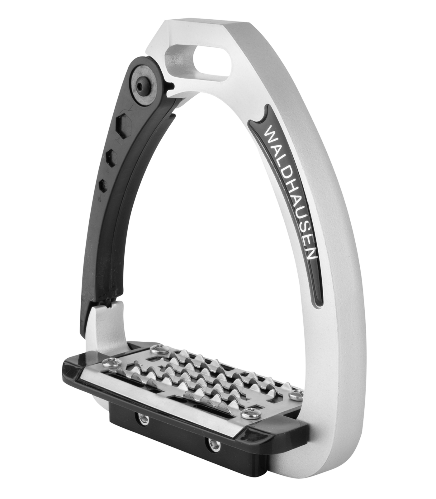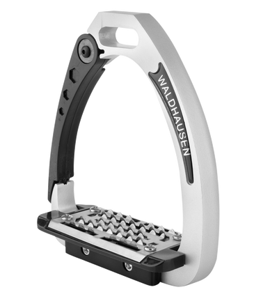 Stijgbeugels van hoogwaardig aluminium met een 6 cm brede en 11 cm lange trede. Met scharnier aan de buitenkant. Het gewicht van de ruiter zorgt ervoor dat het scharnier bij een val opengaat en voorkomt dat het in de stijgbeugels blijft haken.
