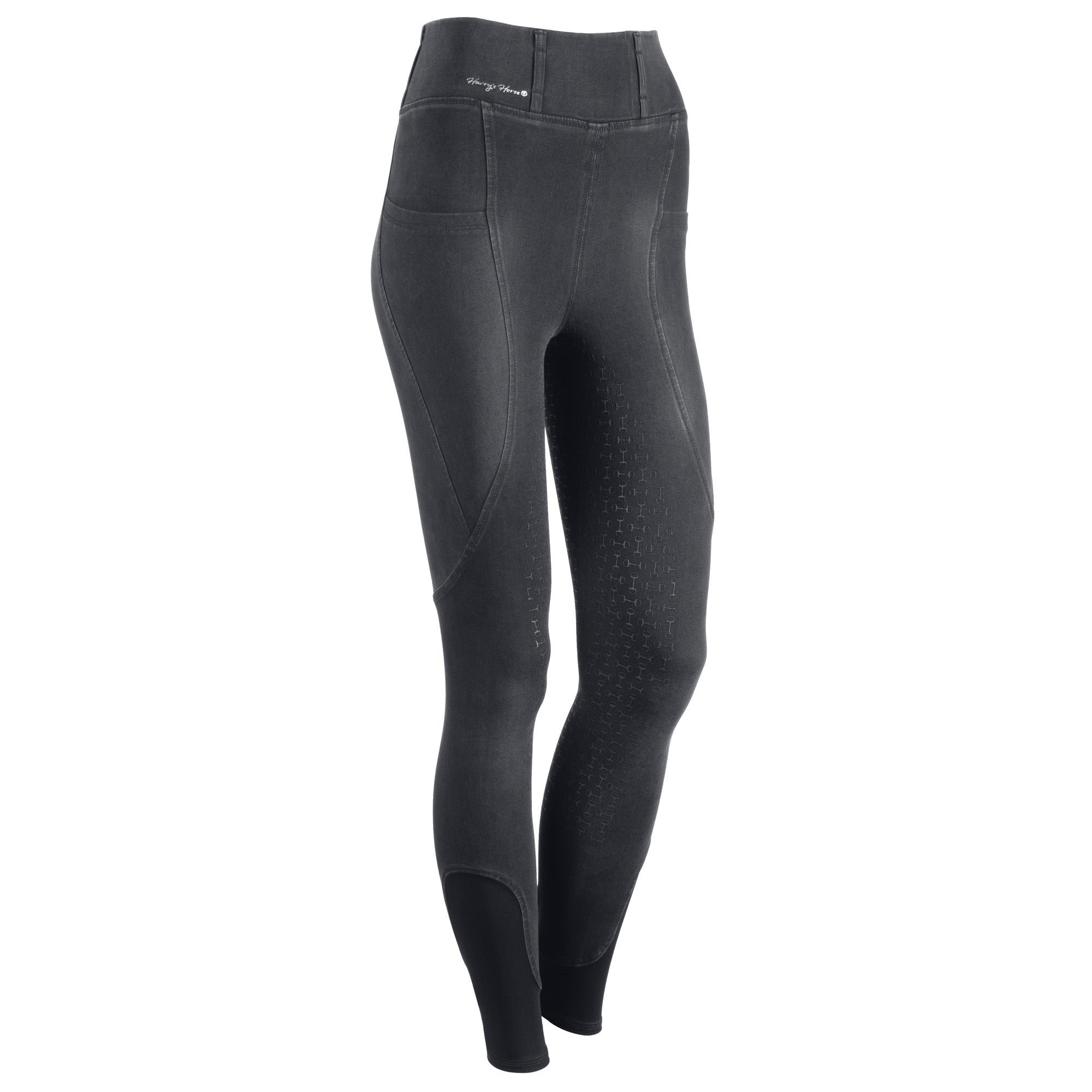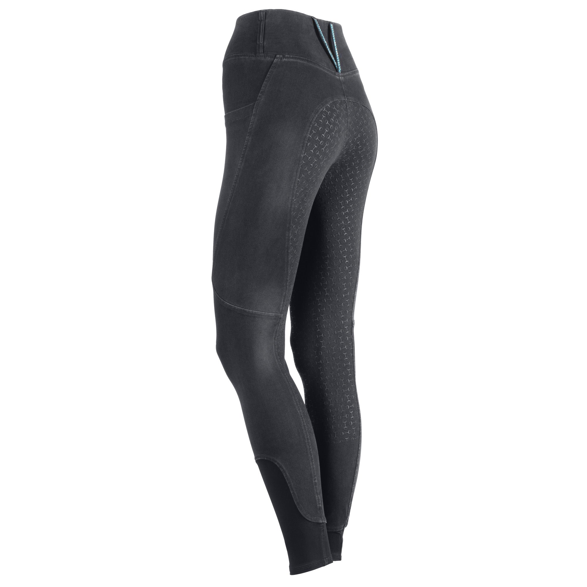 Sportieve rijlegging in een Denim look met een brede tailleband voorzien van riemlussen waarbij de lange riemlussen op de achterkant zijn voorzien van kristallen. Twee zakken aan de zijkant, een rondgenaaid zitvlak voorzien van een fijne siliconen alloverprint met bitjes en een comfortabele elastische inzet rond de enkels.
