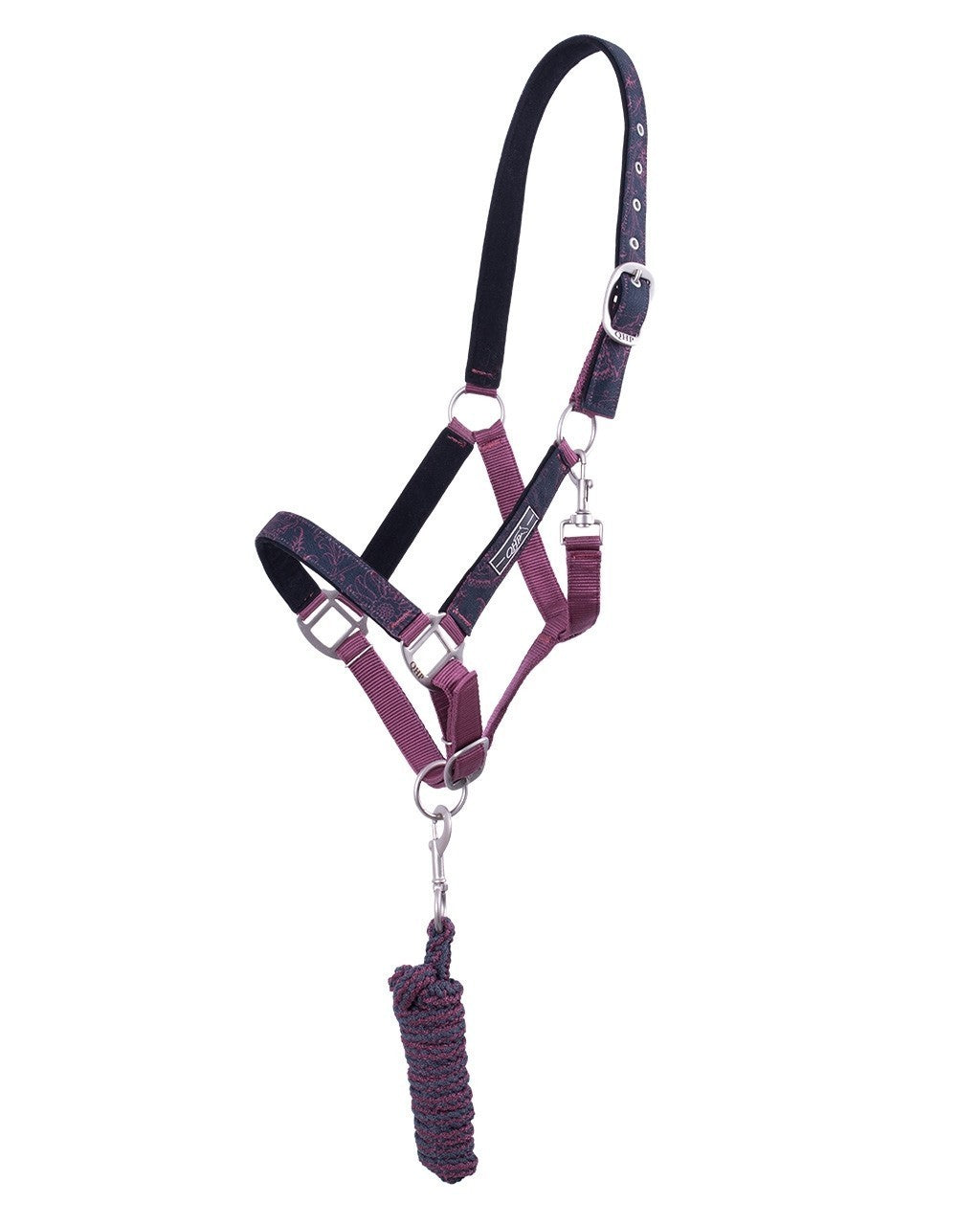 Gepolstertes Halfter-Set mit auffälligem Muster und luxuriösen Satinbeschlägen. Lieferung mit farblich passendem Seil in einer wiederverwendbaren Tragetasche mit Reißverschluss.