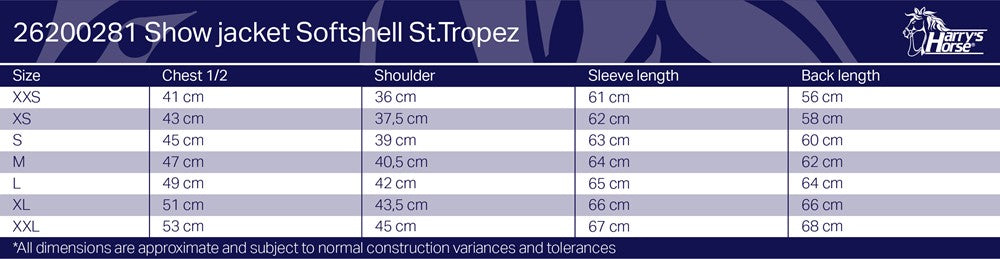 Sportliche Reitjacke aus hochwertigem, atmungsaktivem und wasserabweisendem Softshell. Tailliertes Modell mit 4-Knopfleiste, farbiger Paspelierung am Kragen, zwei Schlitzen auf der Rückseite.